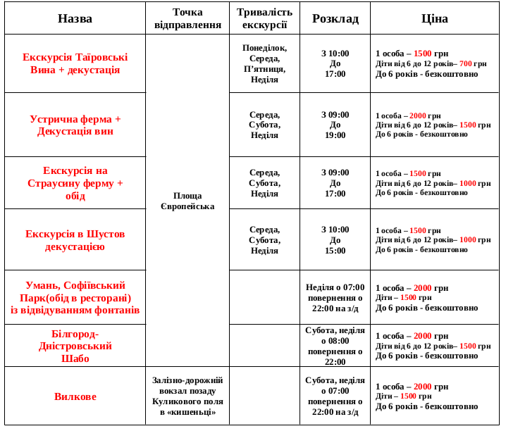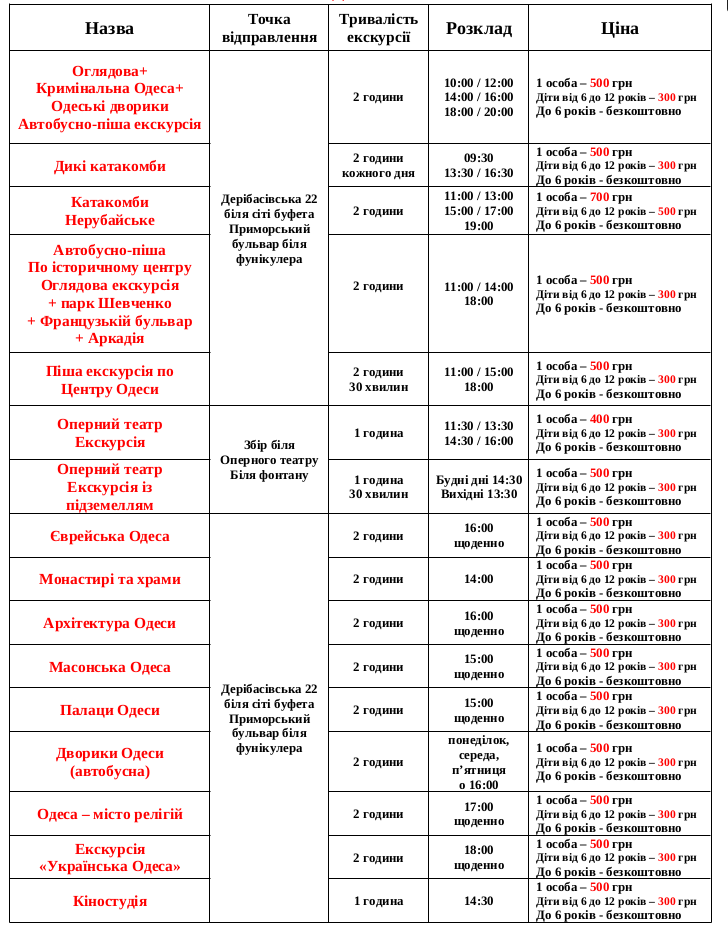 РАСПИСАНИЕ ЭКСКУРСИЙ